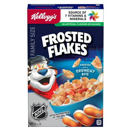 Kellogg's Frosted Flakes* cereal is a source of 7 essential nutrients and has no artificial flavours or colours. The sweet, crunchy flakes provide a great start to the day as part of a nutritious breakfast.
