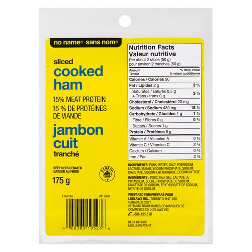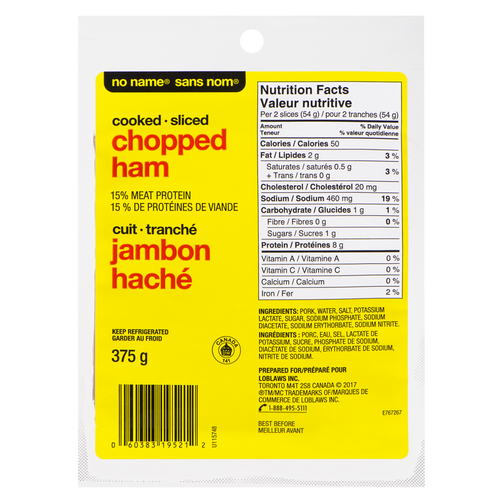 No Name, Cooked-Sliced-Chopped Ham, 15% Meat Protein, Various Weights, 1 Unit